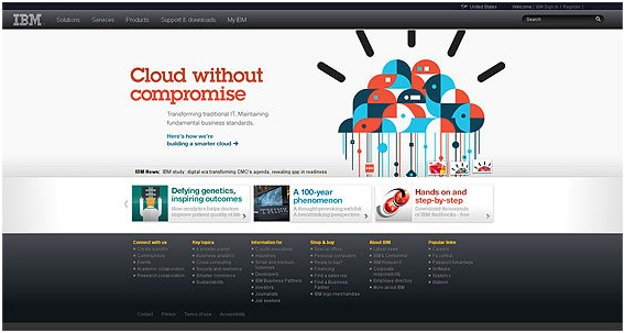 讓頁面變得簡約,簡單大方的風(fēng)格一目了然,容易受到用戶的喜歡,而且讓客戶有安全感。就IBM這個網(wǎng)頁來說,頁面給人專業(yè)和安全的第一感覺。右側(cè)用簡單的集合圖形構(gòu)成的焦點圖,左側(cè)幾行醒目的標(biāo)語用了簡單的漸變。還有蘋果的官網(wǎng)也是典型的簡約大氣的網(wǎng)站。