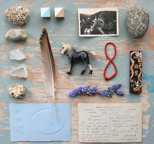 一位來自荷蘭最佳旅游城市格羅寧根的插畫設計師Anja,他的戀物情節完全釋放,她將平時收集的各種小物變身為一套十足反映戀物情節的擺拍,就在一張斑駁老舊的藍漆木桌上,非常整齊的擺弄著生活中很不起眼的一系列物品。九月的綠葉,夏日的貝殼,老照片,牛皮紙舊信封,這些已經失去實用性質的東西卻默默保留著美好的紀念意義,被有心之人如此小心珍藏。