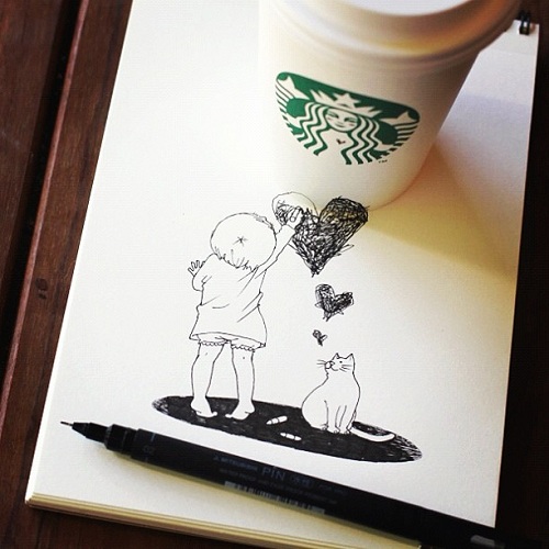 周末一個人在彌漫咖啡音樂和奶茶香氣的里喝最新的下午茶,沉浸在慢半拍舒緩的音樂中,會讓人聽到時間放慢的腳步。幾首溫暖安靜的曲子,或許會讓你想起曾經的一些人,一些事,還有那段回不去的少年時光,或是看到內心尚未迸發出來熱情的光。在這里,除了發呆,上網,玩手機還能做些什么呢?似乎應該更有創意一些。 可以帶上速寫本和水性筆,畫上極富創意有溫馨可愛的涂鴉,將星巴克杯子完美的融入到畫里。這些一幅幅溫馨的小畫,和咖啡杯的一角互動成趣,給下午茶時光增添許多樂趣。下回喝咖啡,也帶上你的涂鴉小本吧。